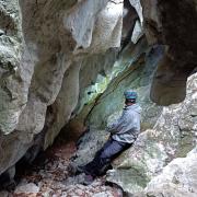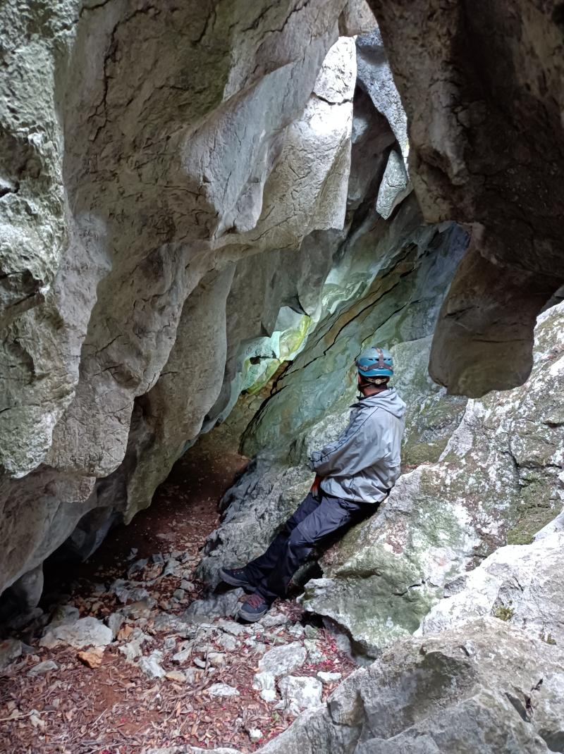 Orifice marquant bien au lidar. Il s'agit d'une faille pénétrable qui atterrit sur un vaste plancher à moins 4m. Les prolongements sont impénétrables. On note que la paroi de la faille est curieusement érodée par l'eau.