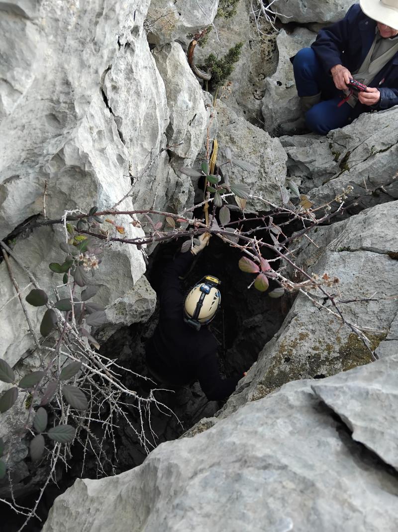 Visité en Janvier 2026 sans agrandissment préalable avec l'aide de la corde. Il s'agit d'une grande faille qui fracture le plateau et occasionne bien des effondrements. En l'occurence nous descendons d'une dizaine de m pour finir dans une salle latérale. Fond argileux calcaire. Un sqelette de caprin.