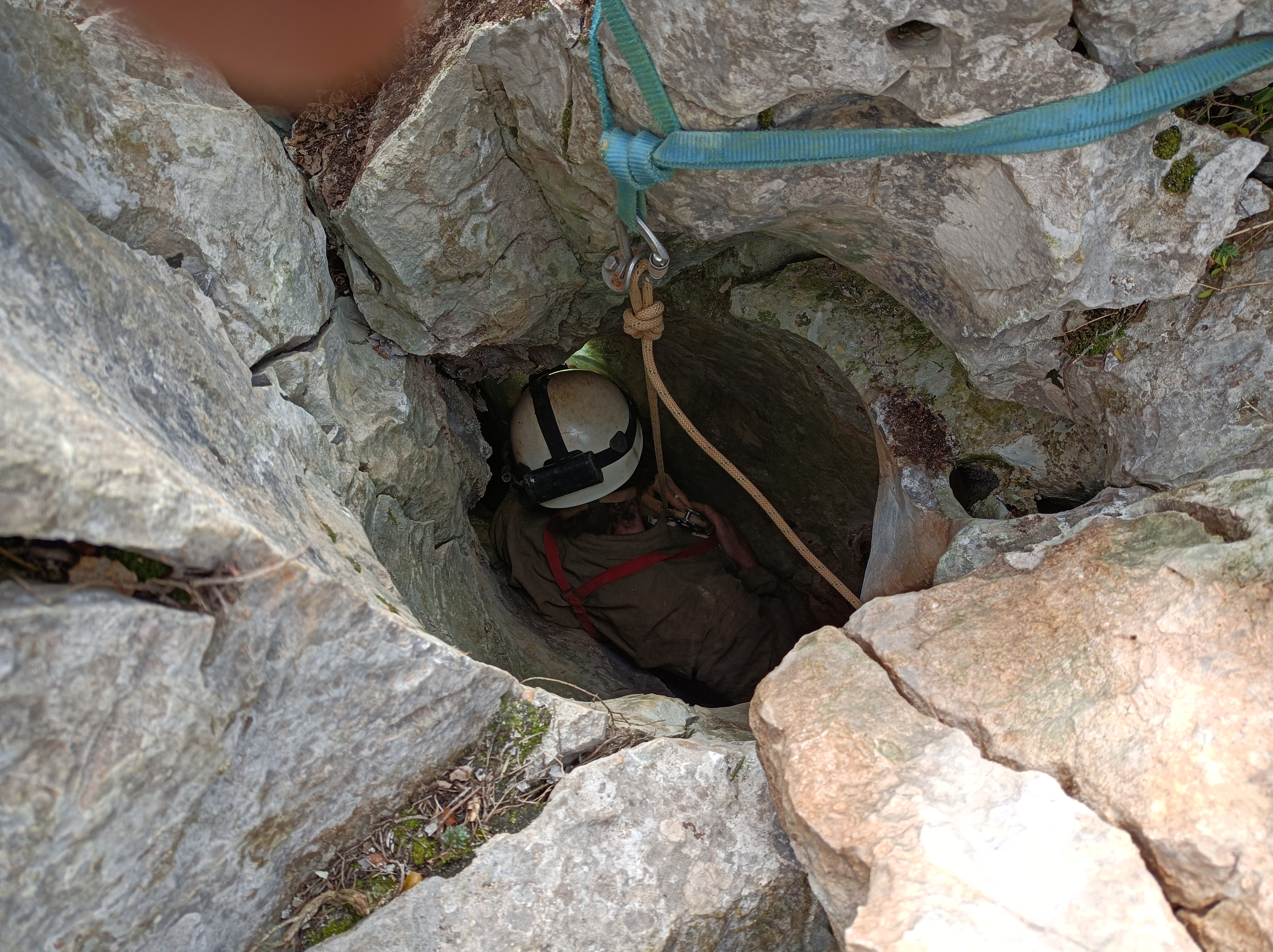 Plus loin nous remontons un correc qui nous emmène sur un puits artificiel de 4 m de diamètre. Le fond à 4 m est en eau. Nous l'avions déjà vu en 2022 https://blog.speleo-club-roussillon.fr/sorties/trois-marioles-chez-la-belle-auriole