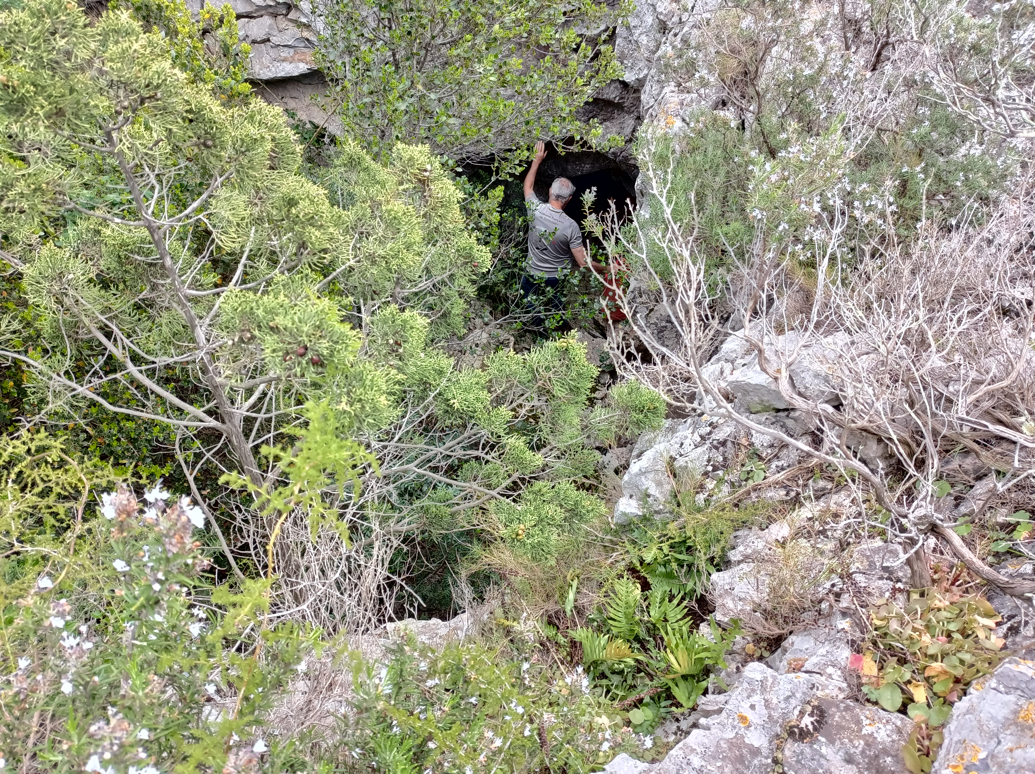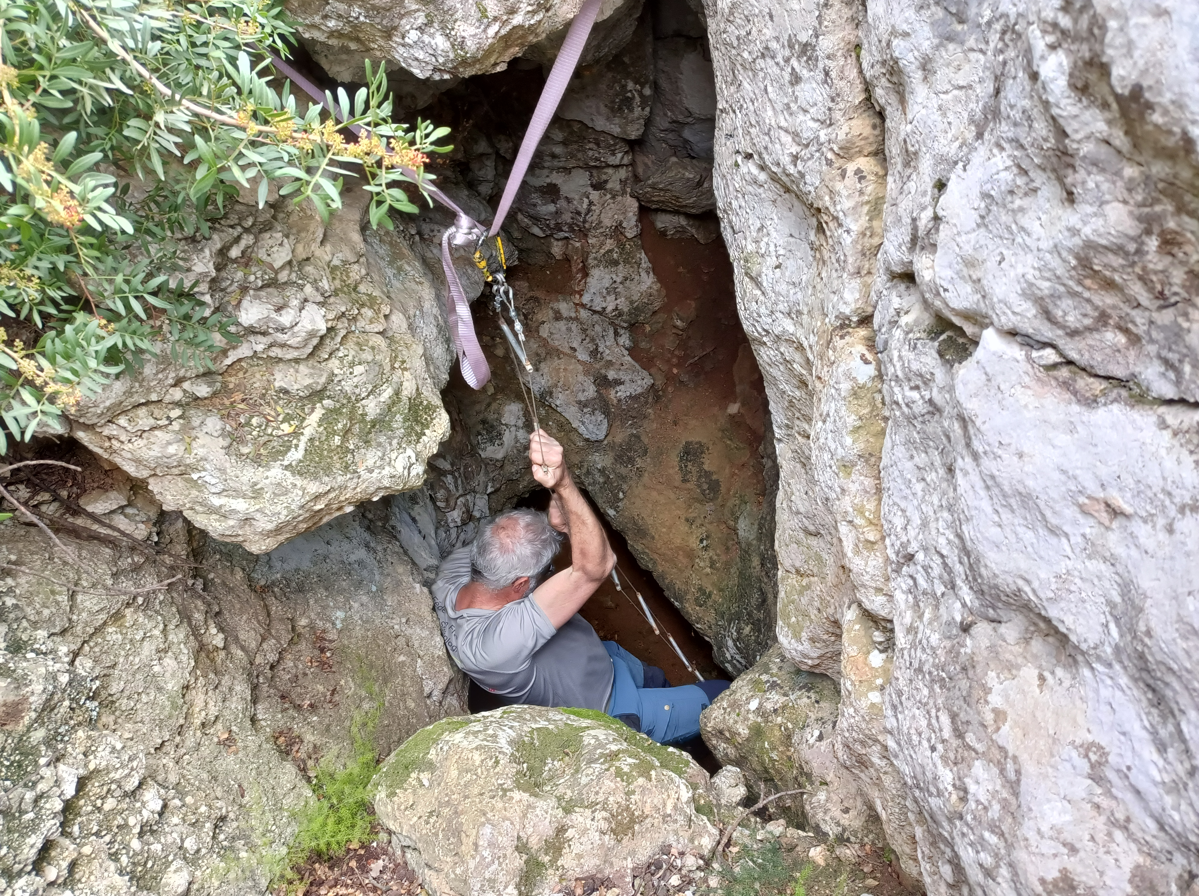 Le BQS 9 : Une doline de 8 m d'ou partent des grottes. Des ossements animaux y sont rangés.