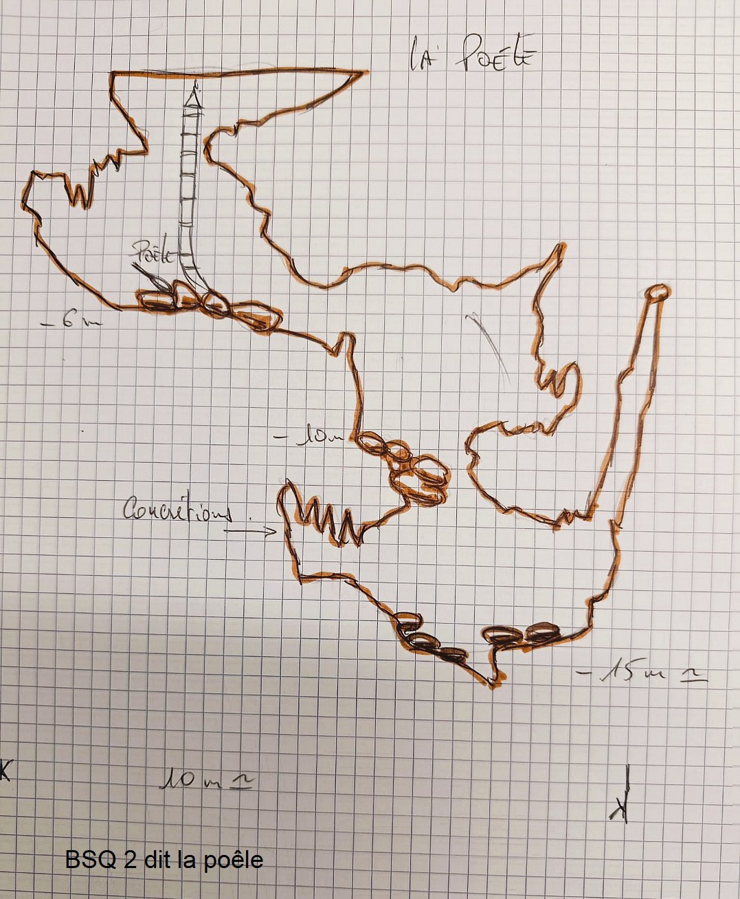Le BQS 2 dit la poêle : On y descend par l'échelle. Une grotte en plan incliné d'une quinzaine de m. Deux salles, des concrétions et une batterie de cuisine dont la poêle. Le fond à une quinzaine de m également. Voir croquis.