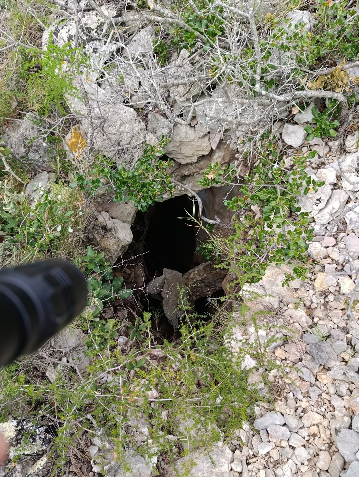 Le BQS 7 : Un superbe puits vertical de diamètre 1,5 à 2 m. Les cailloux tombent sur un fond estimé à 10 m. A revoir avec matos complet.