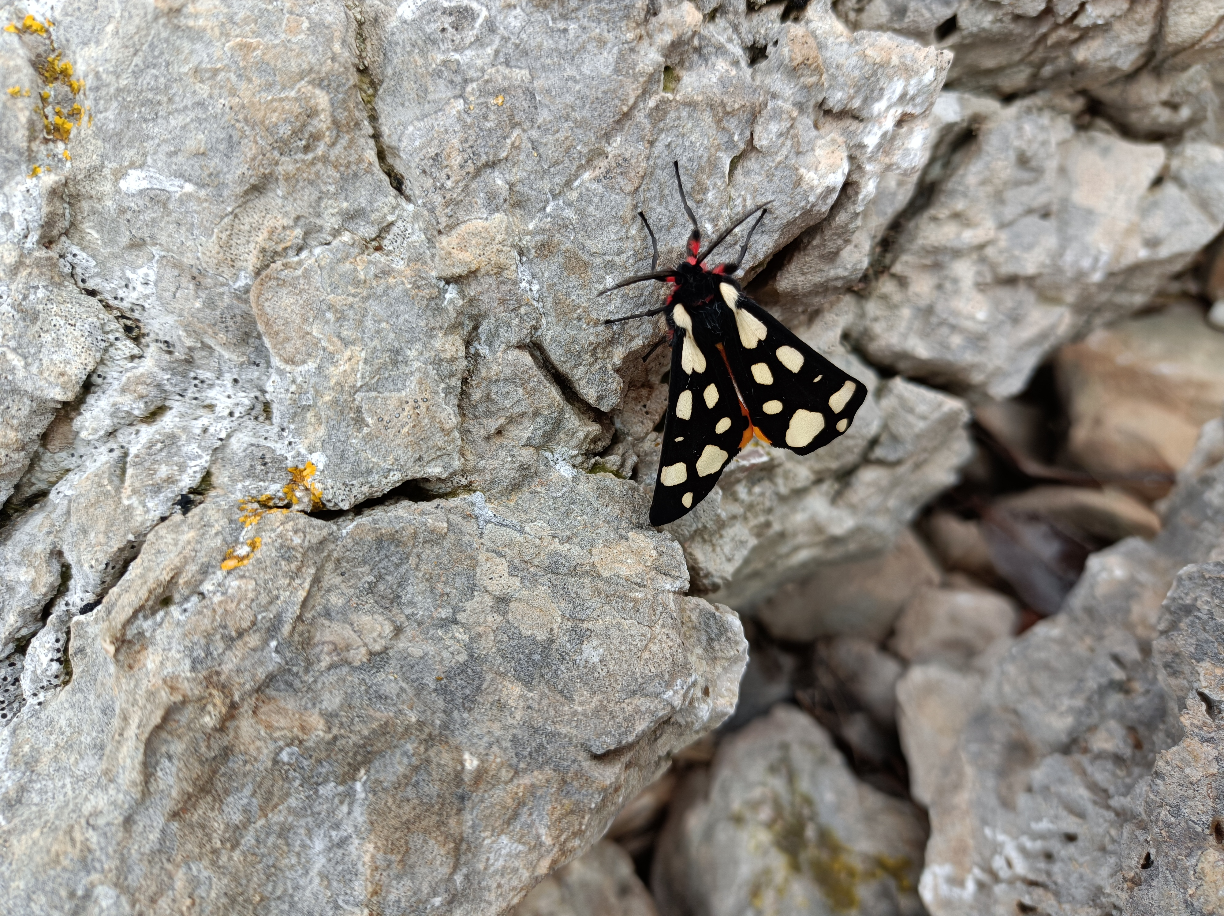 Quant à l'Aven de la Traverse Perdue (topo) que nous aurions voulu trouver. Rien. En consolation un beau papillon dont google nous dit qu'il s'agit d'une Écaille Villageoise ou Fermière.