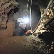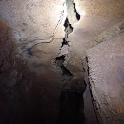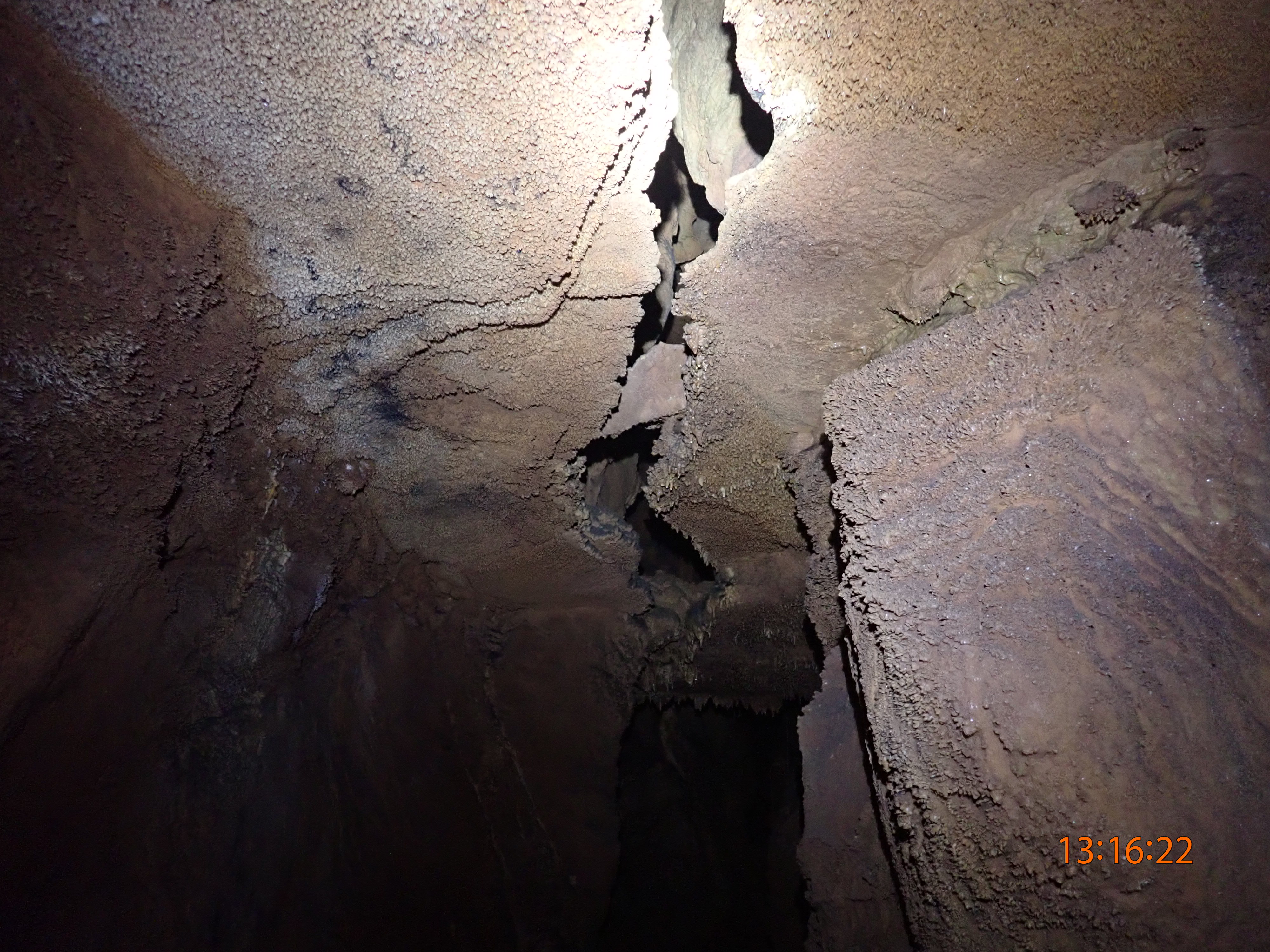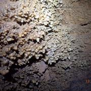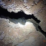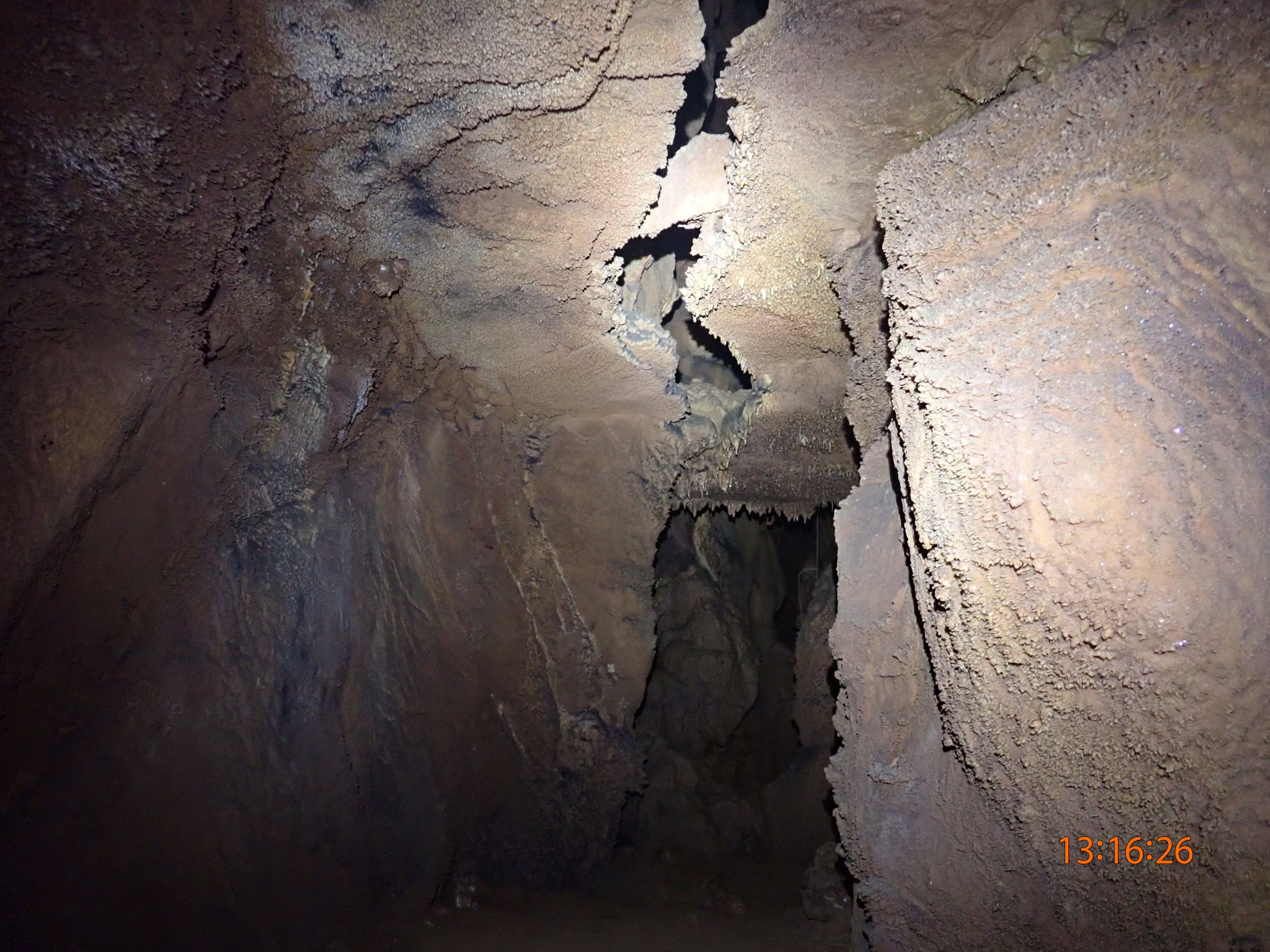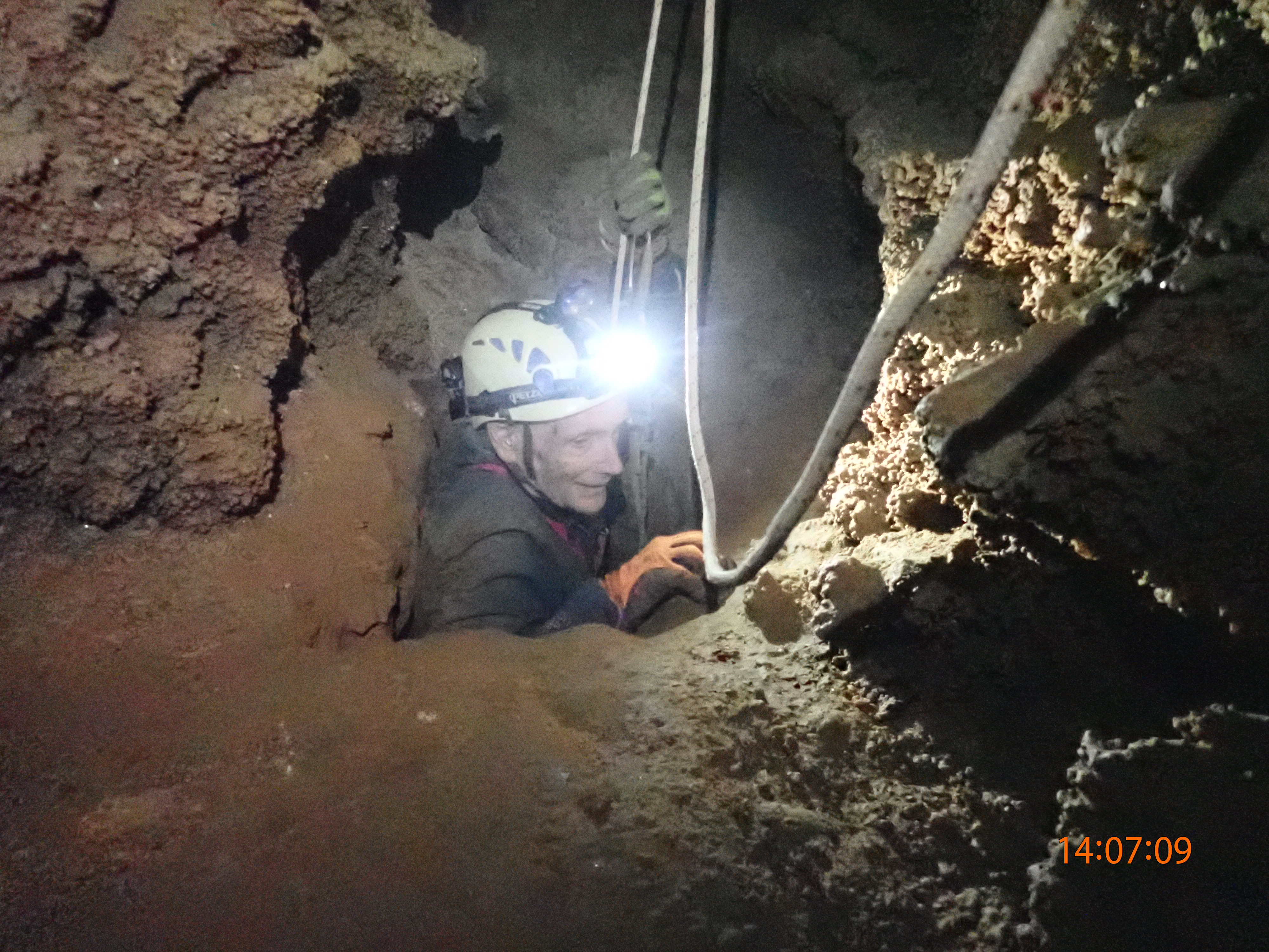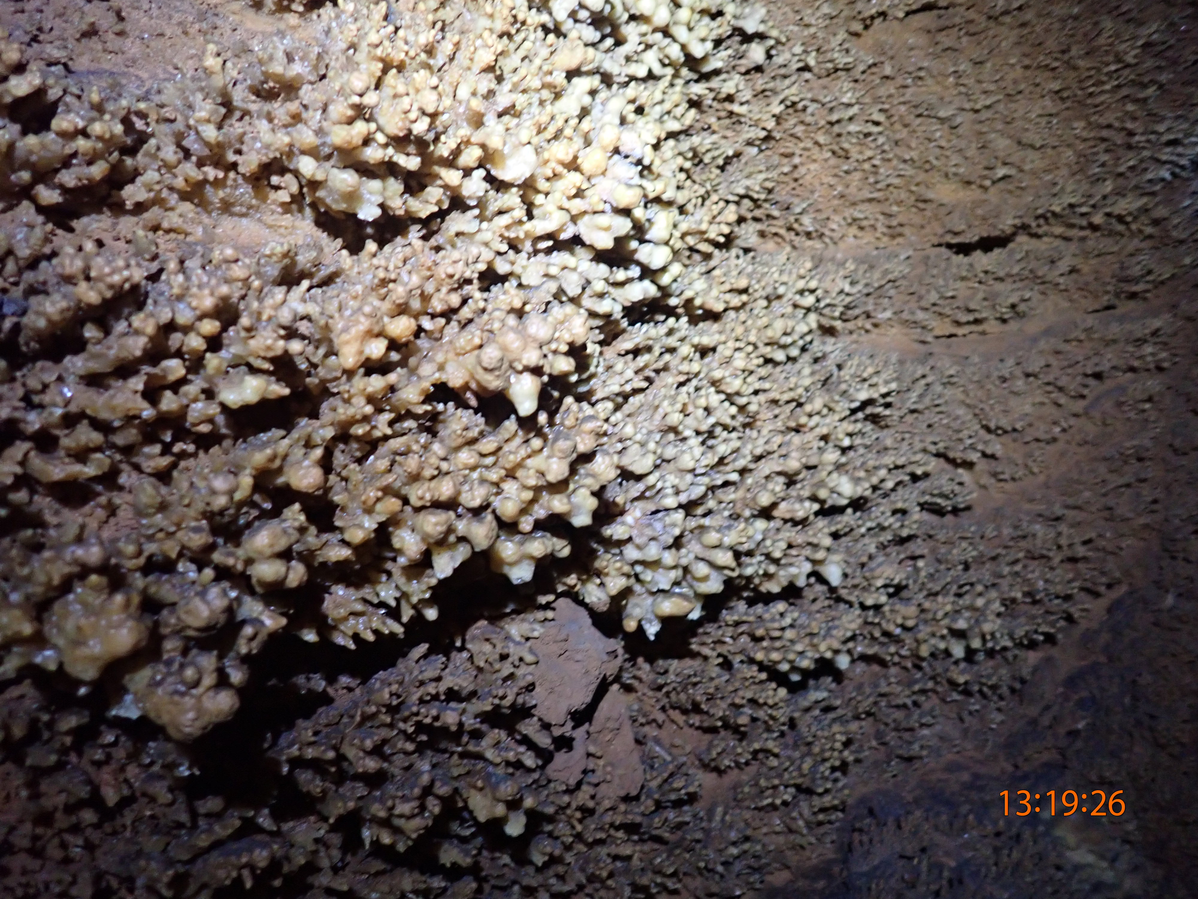 Llo,Hicham et Papix décident de descendre le 2° des 3 réseaux plongeants . Je reste dans la salle à manger pour rechercher une éventuelle vie troglobie dans tous les coins mais sans succès. Ce qui ne m'empêche pas d'admirer un superbe spéléothème, un plancher stalagmitique de venu plafond par le creusement de la galerie sous jacente où je me trouve ( photos )